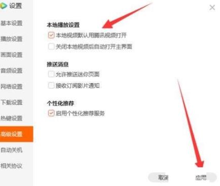 3、最后进入“高级设置”选项后,在“本地播放设置”这一栏下面,勾选“本地视频默认用腾讯视频打开”,点击“应用”即可,如图所示。
